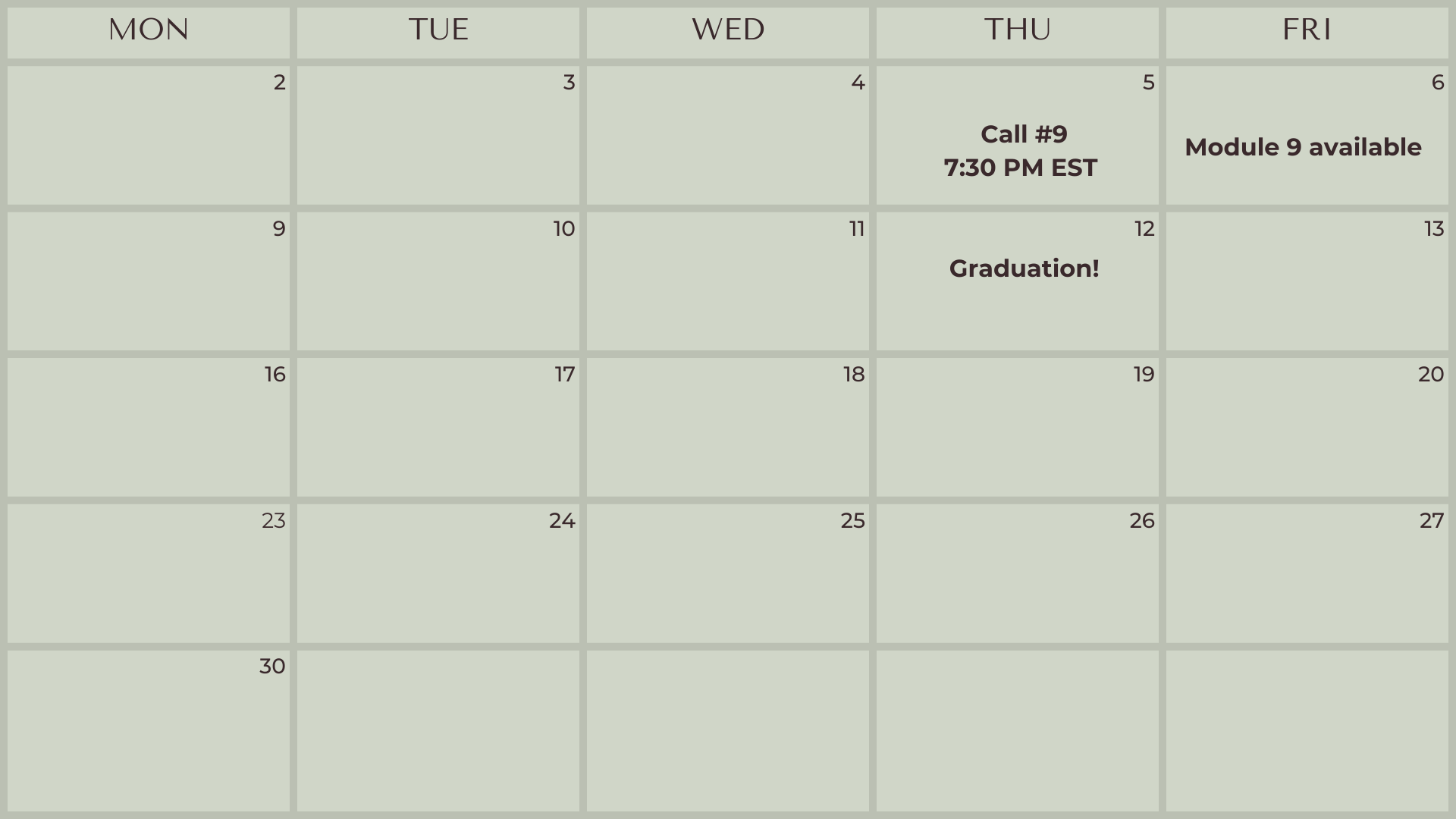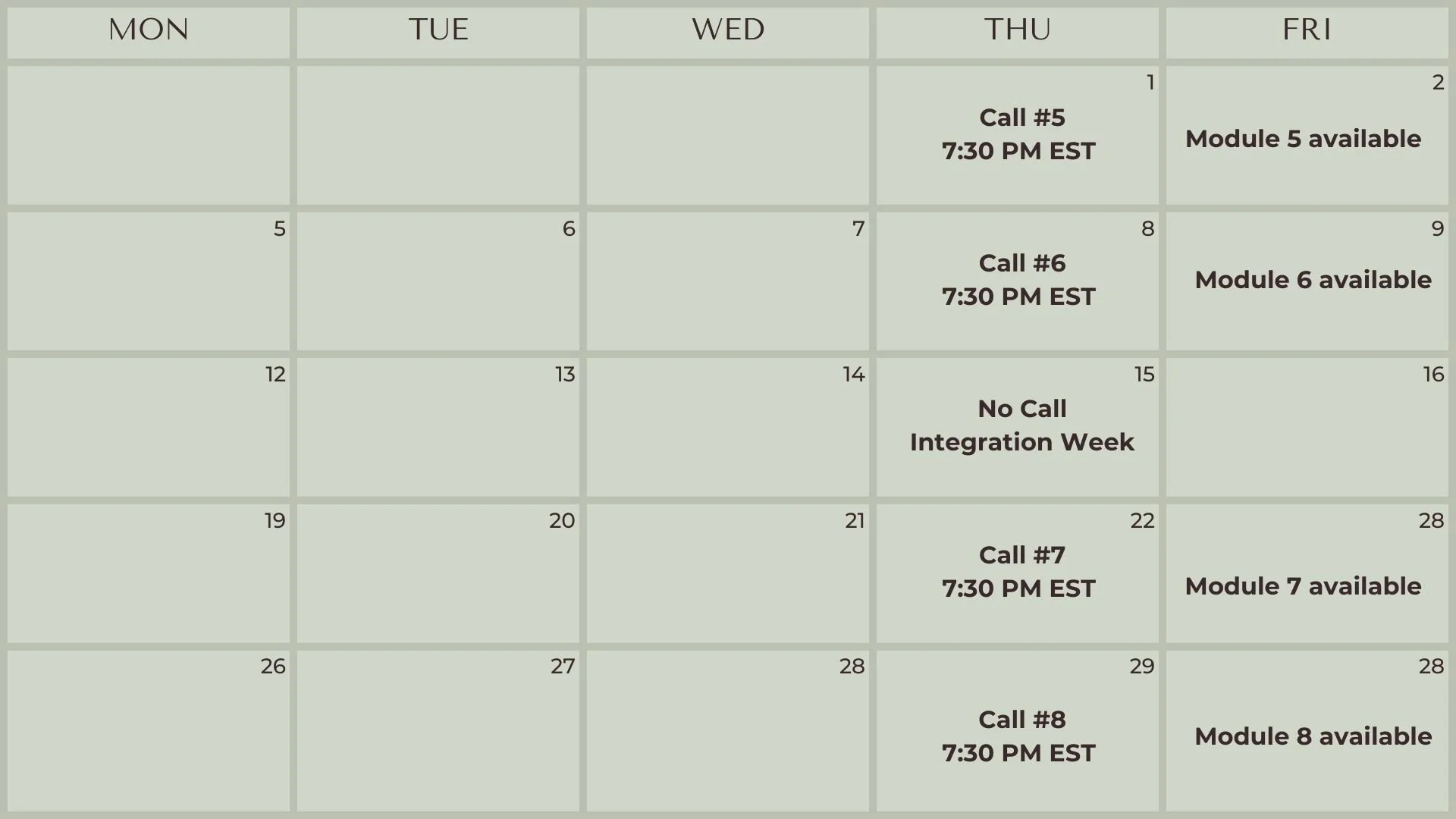 Calls will include time to celebrate the small wins that happen as you make changes in your life, time to ask questions about any of the material from that week or prior weeks, and time for coaching on any issues that are coming up for you and for which you’d like support.